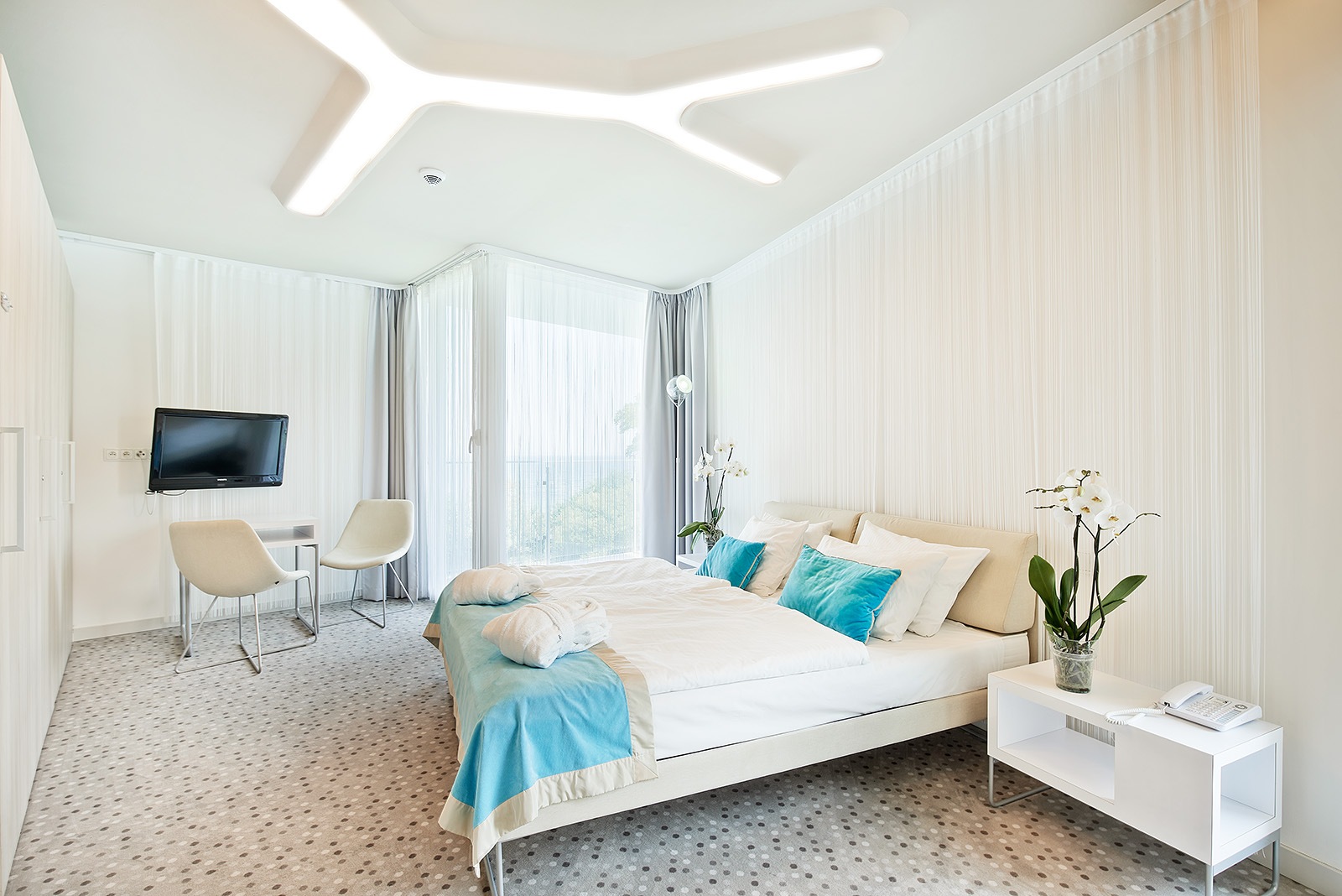 Zimmer: Alle 231 Zimmer sind modern und komfortabel eingerichtet. Die Standardzimmer sind zwischen 24- 28 m2 groß und verfügen über Du/WC, Föhn, Bademantel, Telefon, Flachbild-Fernseher mit Sat-TV, Minibar, Tresor, Internet (freies LAN), französischen Balkon. Sie bieten überwiegend einen herrlichen, seitlichen Blick auf die Ostsee. Es gibt folgende Kategorien: